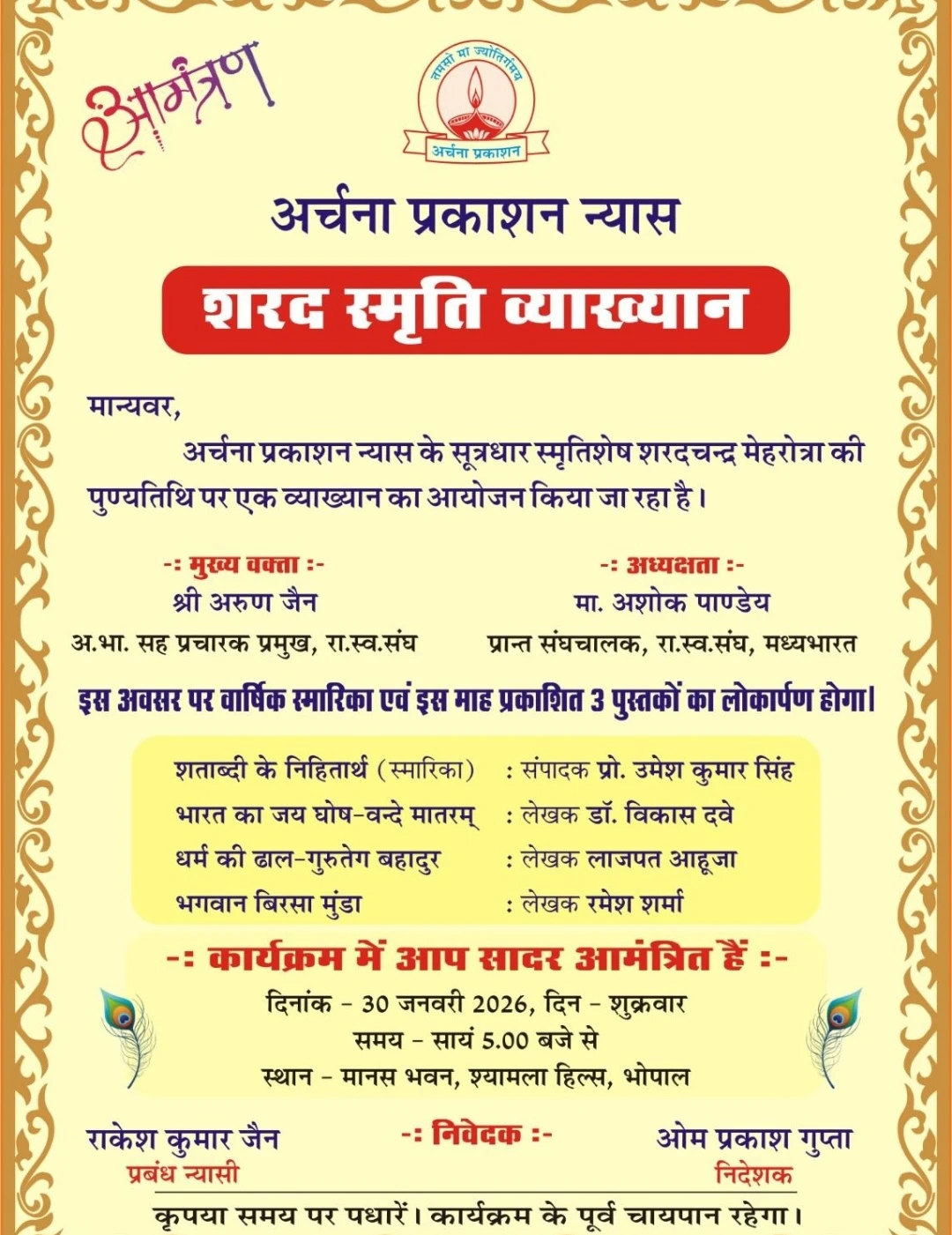 पुस्तक विमोचन भी होगा : भोपाल में 30 जनवरी को होगा ‘शरद स्मृति व्याख्यान’, तीन पुस्तकों का विमोचन