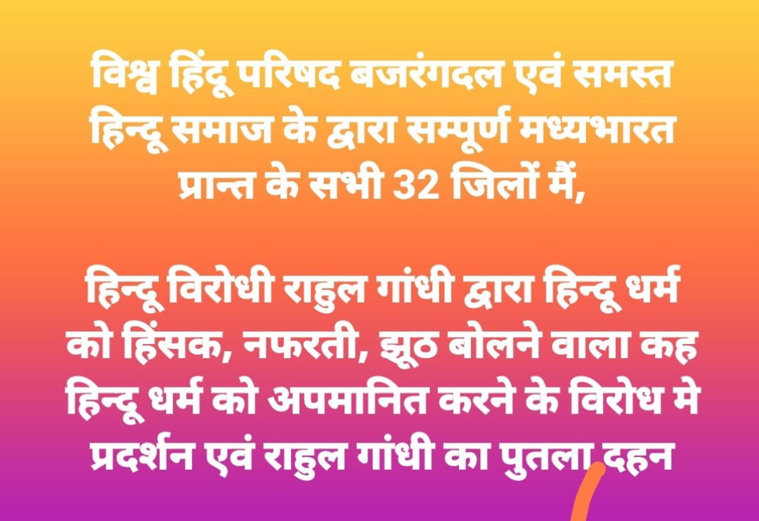 : विश्व हिंदू परिषद बजरंगदल एवं समस्त हिन्दू समाज के द्वारा सम्पूर्ण मध्यभारत प्रान्त के 32 जिलों में आज करेंगे पुतला दहन