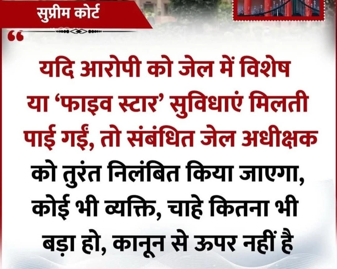 आम जनता के बीच यह संदेश भी जाएगा कि न्याय सबके लिए समान है : सुप्रीम कोर्ट का सख़्त निर्देशः जेलों में ‘फाइव-स्टार’ सुविधाएँ नहीं, दोषी पाए जाने पर अधीक्षक होंगे निलंबित