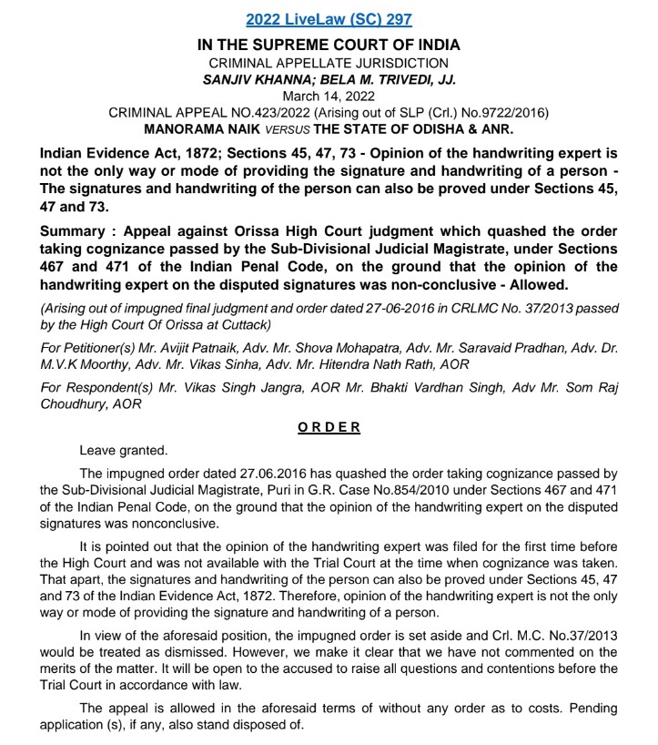 : सुप्रीम कोर्ट ने कहा कि हस्तलेखन विशेषज्ञ की राय किसी व्यक्ति के हस्ताक्षर और लिखावट को साबित करने का एकमात्र तरीका या तरीका नहीं है।