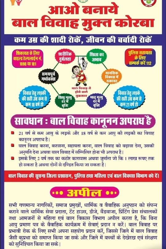 जिला प्रशासन एवं महिला एवं बाल विकास विभाग कोरबा छत्तीसगढ़ ने बाल विवाह की रोकथाम को लेकर विशेष सतर्कता बरतने के निर्देश