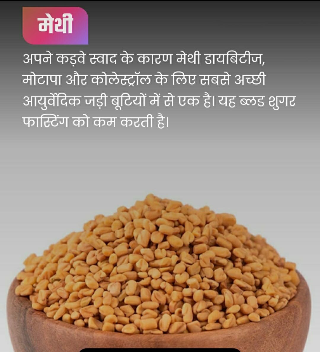 *🌹स्वास्थ्य🌹**सर्दियों में लें मेथी दाना का पूरा लाभ**मेथी के बीज तापवर्धक, वात और कफनाशक, पित्तनाशक, पाचक और हृदय को बल देने वाले और लाभकारी होते हैं। यह एक दृढ, स्फूर्तिदायक, स्फूर्तिदायक टॉनिक के रूप में कार्य करता है। इसे सुबह-शाम पानी के साथ निगलने से पेट स्वस्थ रहता है,कब्ज और गैस से राहत मिलती है। इसे मग के साथ सब्जी की तरह भी खा सकते हैं. यह मधुमेह के रोगियों के लिए बहुत फायदेमंद है।**जितनी उम्र हो उतनी ही मेथी के दानों को रोजाना चबाकर या घूंट-घूंट कर लेने से घुटने और जोड़ों के दर्द, भूख न लगना, हाथों का सुन्न होना, साइटिका, मांसपेशियों में तनाव जैसे बुढ़ापे के रोगों में फायदा होता है। बार-बार पेशाब आना, चक्कर आना आदि। गर्भवती और स्तनपान कराने वाली महिलाओं के लिए भुनी हुई मेथी के आटे में लड्डू मिलाकर बनाने से लाभ होता है।**मेथी दानों से बना शक्तिशाली पेय*