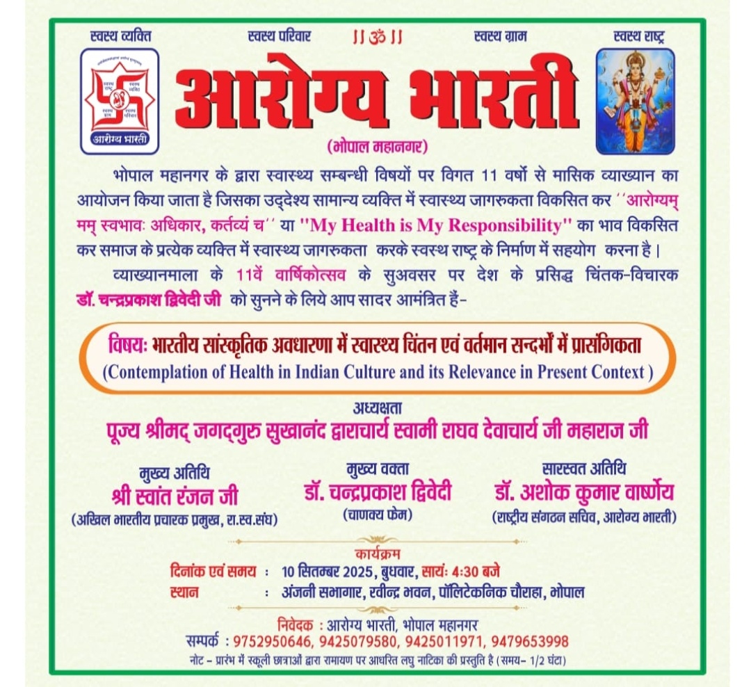 My Health is My Responsibility” पर : चाणक्य’ की दृष्टि से स्वास्थ्य और संस्कृति – आरोग्य भारती भोपाल व्याख्यानमाला का 11वां वार्षिकोत्सव