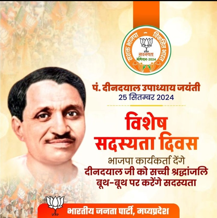 : पं. दीनदयाल उपाध्याय को श्रद्धासुमन अर्पित करके सदस्यता में जुटेंगे पार्टी पदाधिकारी, मुख्यमंत्री, प्रदेश अध्यक्ष, प्रदेश प्रभारी, सह प्रभारी, एवं जिलाध्यक्ष बूथों पर पहुंचकर दिलायेंगे सदस्यता