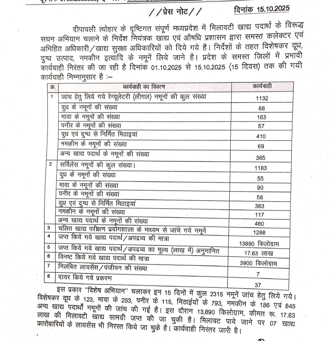 लापरवाही पर कार्रवाई : भिंड की औषधि निरीक्षक आकांक्षा गरुड़ से प्रभार : दीपावली पर मिलावटखोरी के खिलाफ प्रदेशव्यापी सघन अभियान, 17.83 लाख की मिलावटी खाद्य सामग्री जप्त